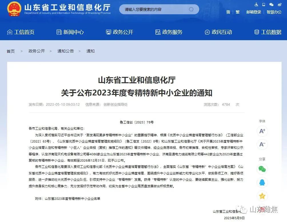 5月10日,山東省工業和信息化廳發布了《山東省2023年度專精特新中小企業名單公示》,振興新材料公司、振興炭材公司被認定為“山東省2023年度專精特新中小企業”。