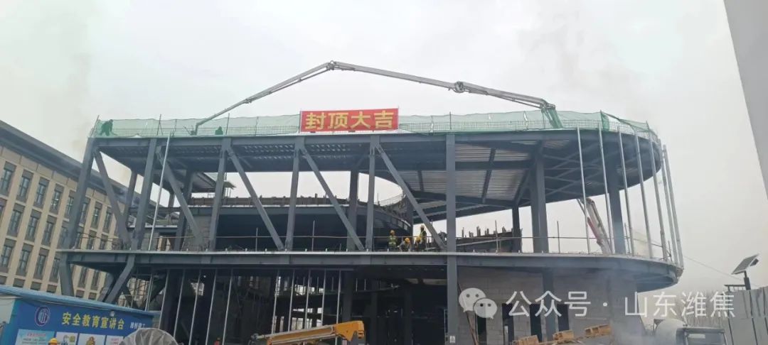 11月16日,伴隨著一車混凝土澆筑的完成,濰焦文化中 心項目經過72天爭分奪秒日夜奮戰,主體架構順利封頂。